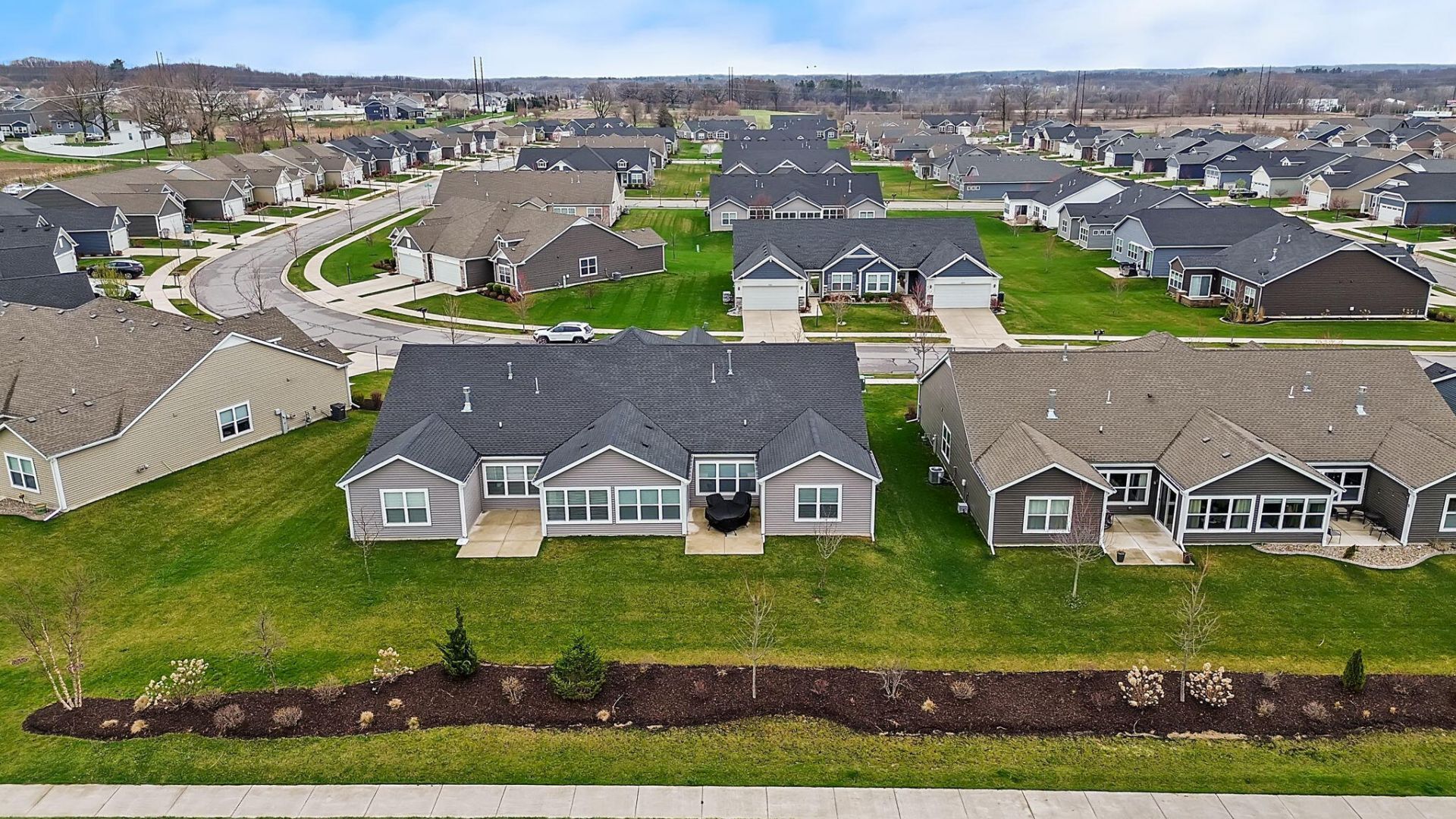 Discover your dream home! This immaculate, maintenance-free duplex features a spacious ranch floor plan enhanced with exquisite upgrades, making it perfect for modern living. The highly sought-after Brighton floor plan includes two generous bedrooms and two full bathrooms, along with a versatile flex room with elegant French doors, ideal for a den, home office, or formal dining area. The spacious open concept living space offers large living room and a stunning kitchen that boasts painted cabinets, luxurious granite countertops, a sizable island, and stainless steel appliances. The owner's suite is a true retreat, featuring an en-suite bath complete with a double vanity, a walk-in shower, and a walk-in closet. Enjoy additional living space in the sunroom--a tranquil spot that can serve as an office, cozy sitting area, or extra dining space--conveniently located off the eat-in kitchen with easy access to your private patio. For easy living, enjoy the benefits of an irrigated lawn, with mowing and snow removal taken care of for you! This home includes upgraded trim, fixtures, and thoughtful details throughout, ensuring a stylish and comfortable lifestyle. Benefit from energy-efficient living with a third-party certified energy rating and a ten-year structural warranty.